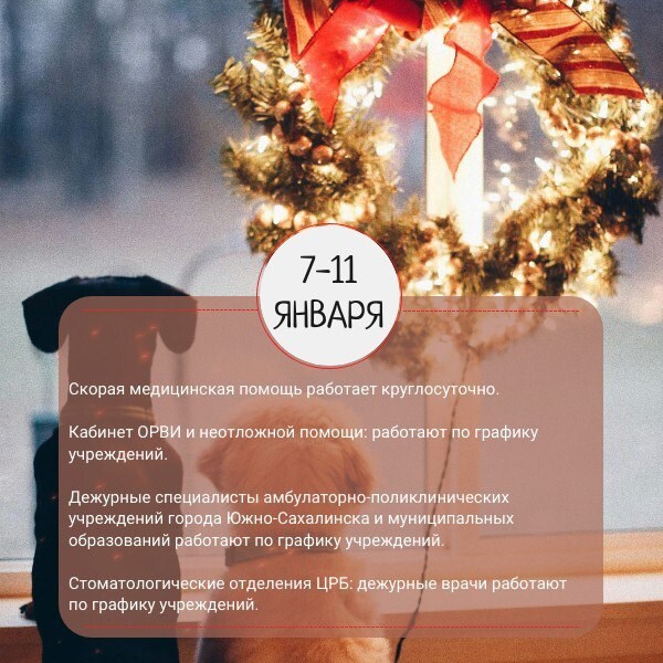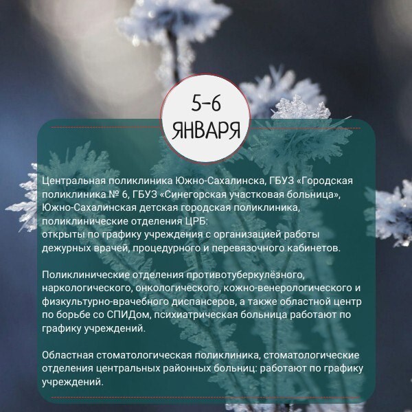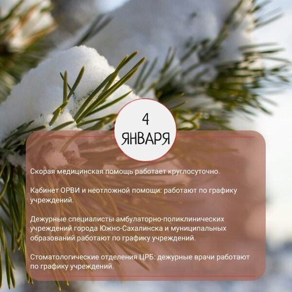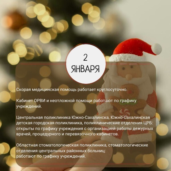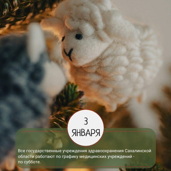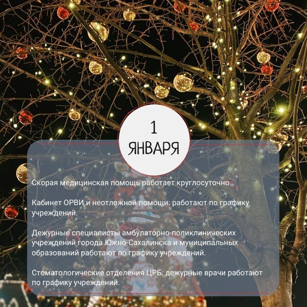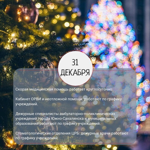 График работы медицинских учреждений Сахалинской области в новогодние праздники опубликовали в региональном минздраве. Для удобства жителей в ведомстве сделали карточки по датам.