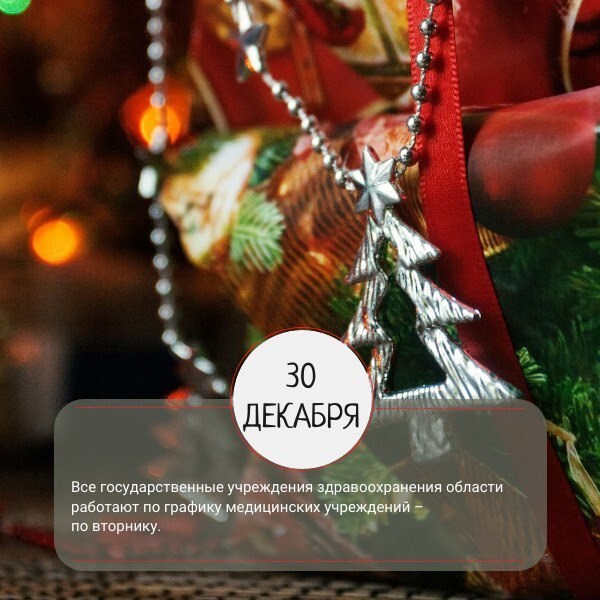 30 декабря все государственные учреждения здравоохранения области будут работать по графику медицинских учреждений – по вторнику, с 12 января – в обычном режиме.