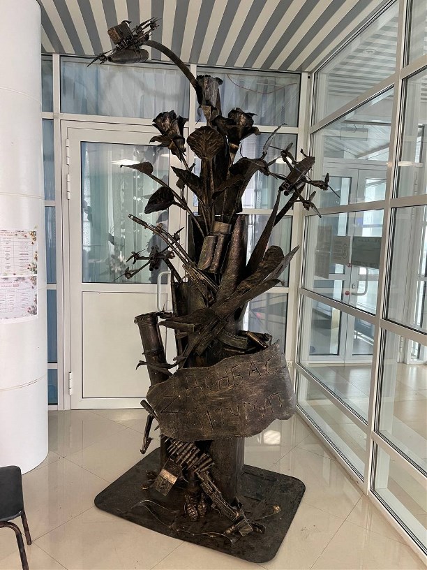 В фойе районного дома культуры и спорта в Курильск для общего обозрения представили инсталляцию «Во имя жизни». Металлическая композиция создана из фрагментов трофейного вооружения, собранного сахалинцами в Донецкой Народной Республике в зоне проведения специальной военной операции.