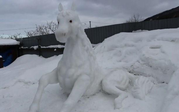 На создание снежной лошади ушло несколько недель кропотливой работы. Мастер использовал природные и подручные материалы, а также собственную фантазию и многолетний опыт. Итогом стала ещё одна впечатляющая фигура, которая уже стала точкой притяжения для жителей и гостей села.