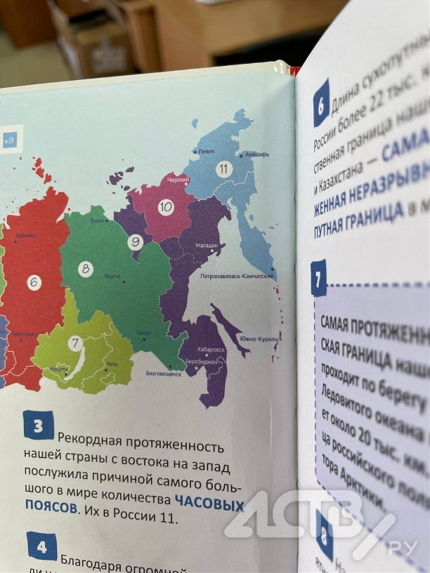 В другой книге этого же издательства, но предназначенной для детей уже школьного возраста ("Рекорды России"), остров Сахалин относят к часовому поясу "+7 от московского времени", а Курильские острова - к "+8 часов".