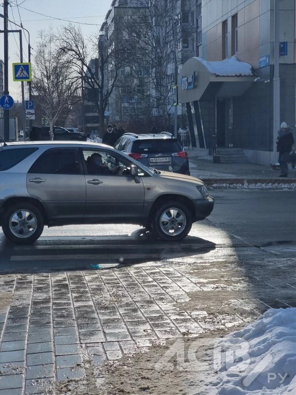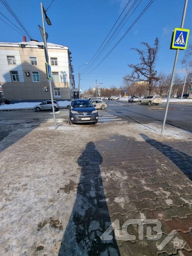 Странный способ парковки автомобилиста шокировал жителей Южно-Сахалинска. Водитель бросил своего железного коня прямо на "зебре" рядом с дорожным знаком.