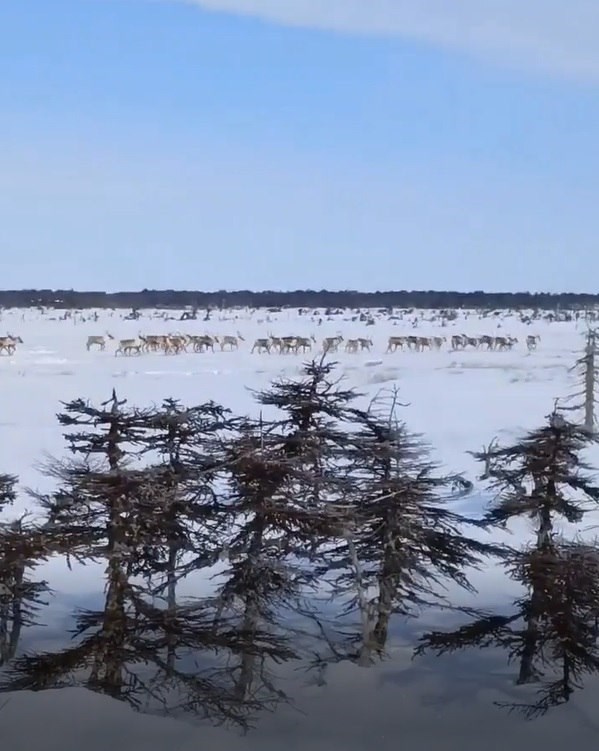 Редкие кадры: лесничие встретили большое стадо северных оленей во время зимнего учёта