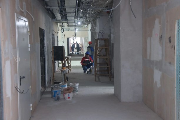 Сейчас уровень технической готовности здания составляет 65 процентов. В помещениях идут отделочные работы, монтаж внутренних электросетей.