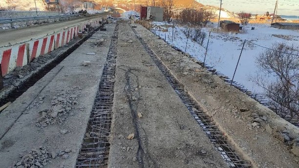 "На левой стороне уже завершили разборку части сопряжения моста с насыпью в начале и конце моста, демонтаж шкафной стенки, выполнили подъем и опускание балок пролетного строения, ремонт подферменников. Сейчас подрядчик выполняет разборку продольных швов омоноличивания балок пролетного строения. В работах задействованы 4 единицы техники и 9 человек", - рассказал руководитель ГКУ "Управление Сахалинавтодор" Вадим Думанский.