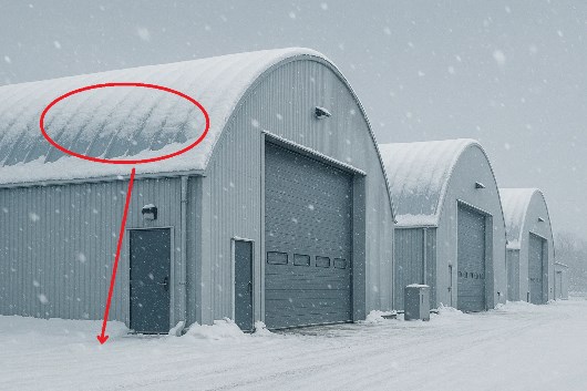 Судя по недостроенному ангару на фото в теме - снег при всём желании не смог бы скатываться на пешеходную дорожку с него, а с достроенного - да