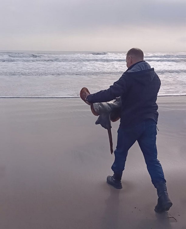 Спасение большехвостого ската (Dipturus macrocauda) на тихоокеанском побережье Кунашира. 16.03.2026. Автор фото: Елена Шыманьска.