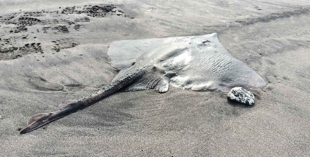 После весеннего шторма сотрудники заповедника "Курильский" обнаружили на побережье Кунашира интересную находку – выброшенного сильными волнами крупного ската.