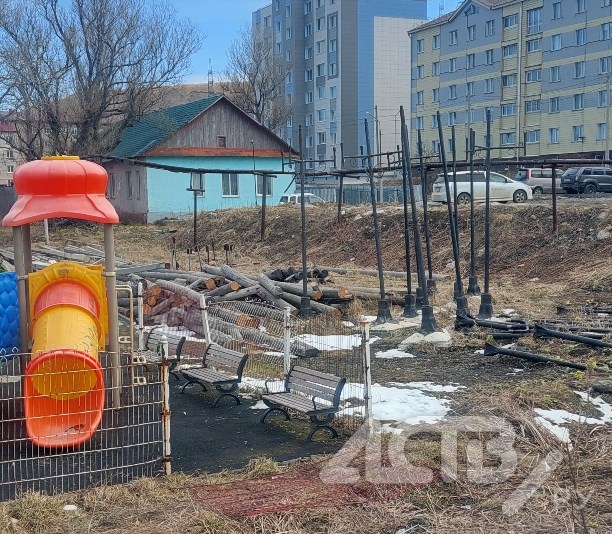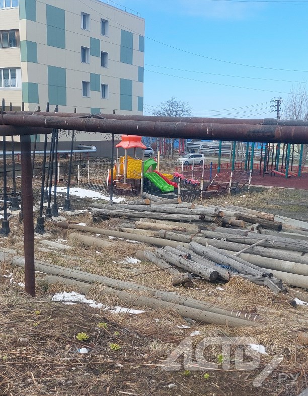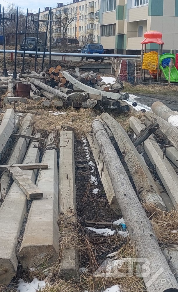 Стихийный склад стройматериалов прямо под окнами жилых домов устроили в Холмске на ул. Матросова, 6Б. Местные жители сообщают, что свалка находится в непосредственной близости от детских площадок.