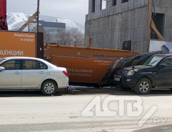 На улице Дзержинского, 41/1 в Южно-Сахалинске, где ведётся строительство ЖК "Легенда", во время порыва ветра обрушился забор. По словам очевидцев, он упал прямо на припаркованные рядом автомобили.
