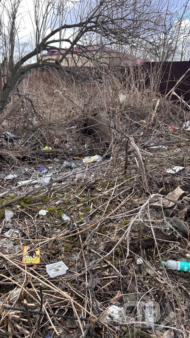 Пустырь, небольшие заросли деревьев, ручеёк - все это завалено плотным слоем мусора. Упаковка от еды, бутылки, пустые пачки, обёртка, окурки - вряд ли это принесло ветром с ближайшей помойки. Скорее всего, несознательные горожане кидали ненужное себе под ноги. Растаявший снег просто оголил людское свинство.