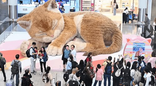 Гигантский интерактивный рыжий кот радует путешественников в аэропорту