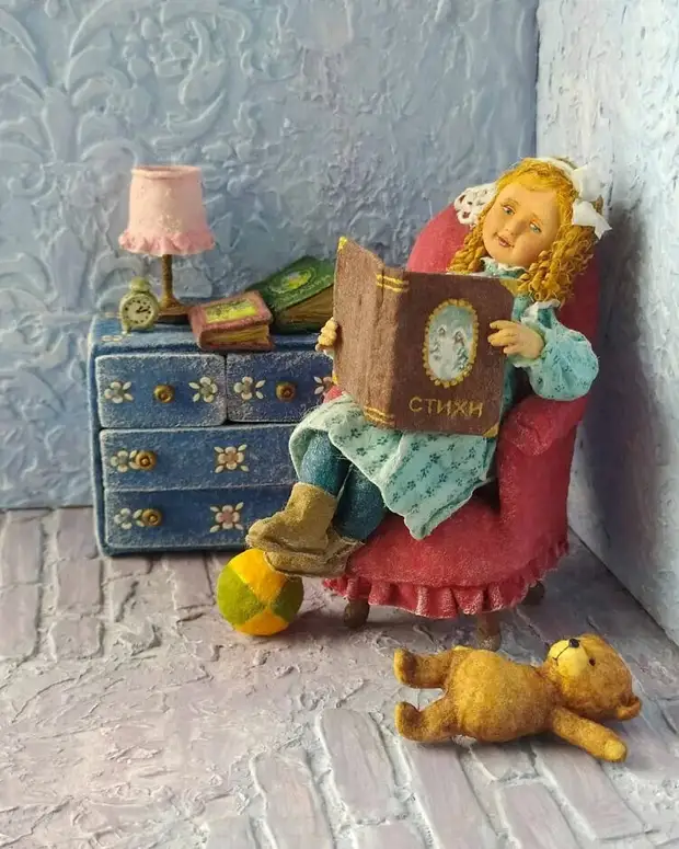 На создание одной игрушки у мастера может уйти целый месяц. Ирина тщательно прорабатывает детали, из ваты сделано всё - люди, одежда, мебель, предметы интерьера.