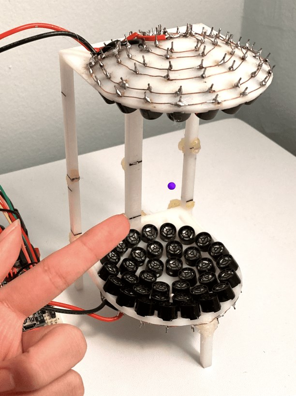 Фиолетовый шарик подвесили в воздухе благодаря звуковым волнам, исходящим от круглых динамиков / https://www.nyu.edu