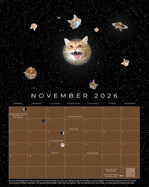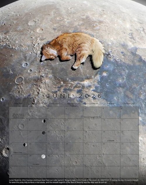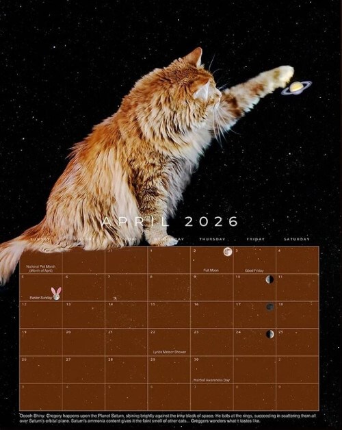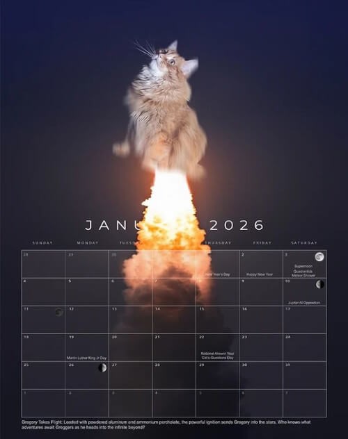 В новом “Космическом кошачьем календаре” на 2026 год впечатляющие фотографии мастера сочетаются с любопытными выражениями мордочки и игривыми реакциями питомца, превращая далёкие звёзды и планеты в сцены, которые кажутся тёплыми и личными.