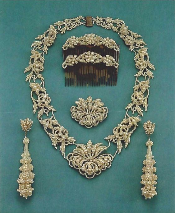 Это было время, когда царила символика, и символические значения были привязаны к разным видам драгоценных камней и ювелирных мотивов, используемых в личных украшениях. Украшения с семенами жемчуга были связаны с невинностью и чистотой и считались идеальными ювелирными изделиями для подарка юным девушкам на их 18-й день рождения, как её первые официальные ювелирные украшения, или для невесты в день ее свадьбы.