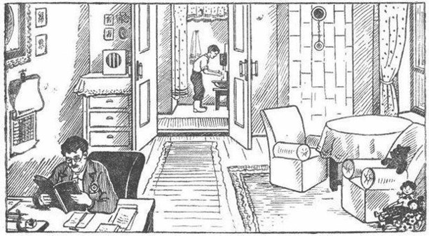 1. Квартира показана зимой: мальчик в валенках; печка истоплена,— на это указывает открытый отдушник.