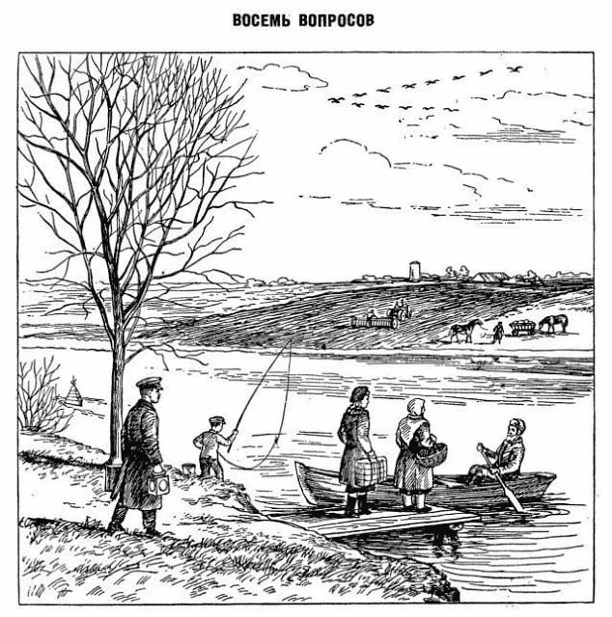 7. Мостки и лестница, спускающаяся к реке, а также лодка с пассажирами показывают, что в этом месте налажен постоянный перевоз через реку. Он нужен здесь потому, что поблизости нет моста.