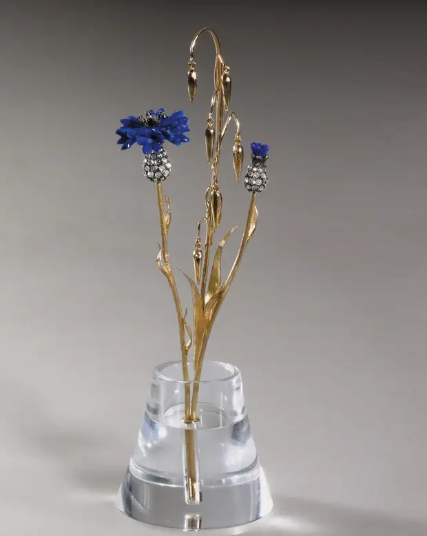 Ювелирная работа "Васильки и овес": бадахшанский лазурит, горный хрусталь, алмазы в огранке "роза", золото, серебро, позолота