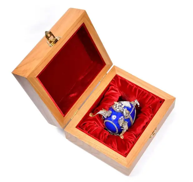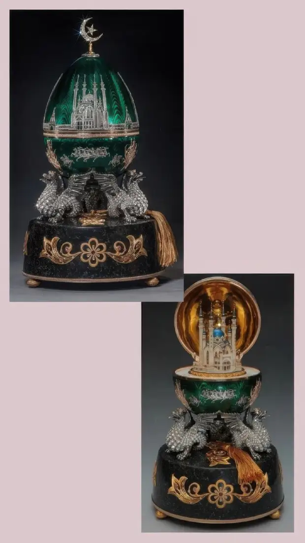 Пасхальное яйцо "Создателям Санкт-Петербурга" и пасхальное яйцо-ночник, которое изначально было заказано королём Марокко Хасаном II в качестве свадебного подарка для дочери.