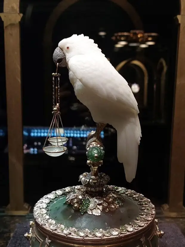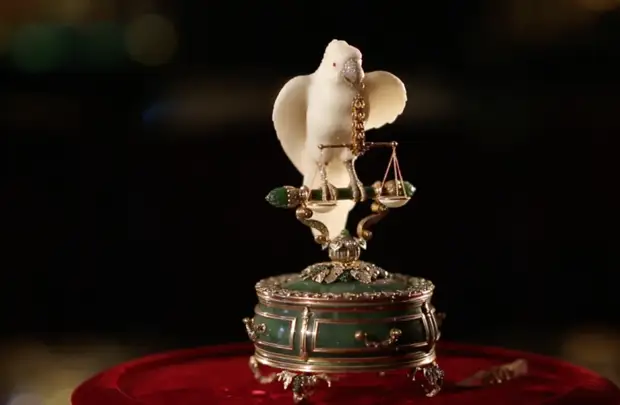 Ювелирное произведение "Весы" с белым попугаем. В шкатулках из нефрита хранятся маленькие грузики 5,10 граммов для взвешивания