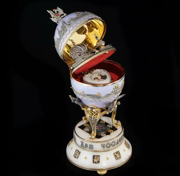 Пасхальное яйцо "400 лет дома Романовых". Золото, бриллианты, алмазы в огранке "роза", рубины, изумруды, сапфиры, белый нефрит, черная яшма, мрамор, кость мамонта