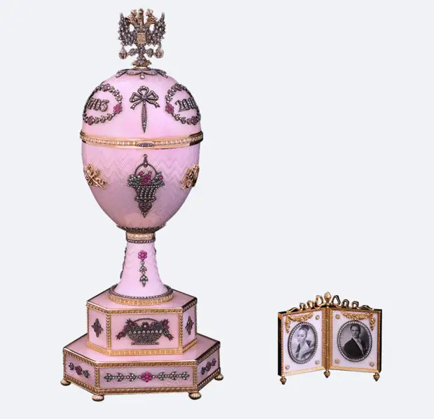 Пасхальное яйцо "300 лет Санкт-Петербургу". Гильошированная эмаль, алмазы в огранке "роза", бриллианты, гранаты, серебро, позолота, кость. Сюрприз яйца - двойная рамка для памятных фотографий