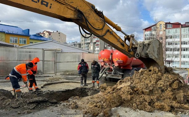 Повреждение водопровода в районе дома №100 по ул. Горького устраняют в Южно-Сахалинске 12 ноября. На месте работают сотрудники аварийно-восстановительной бригады "РВК-Сахалин".