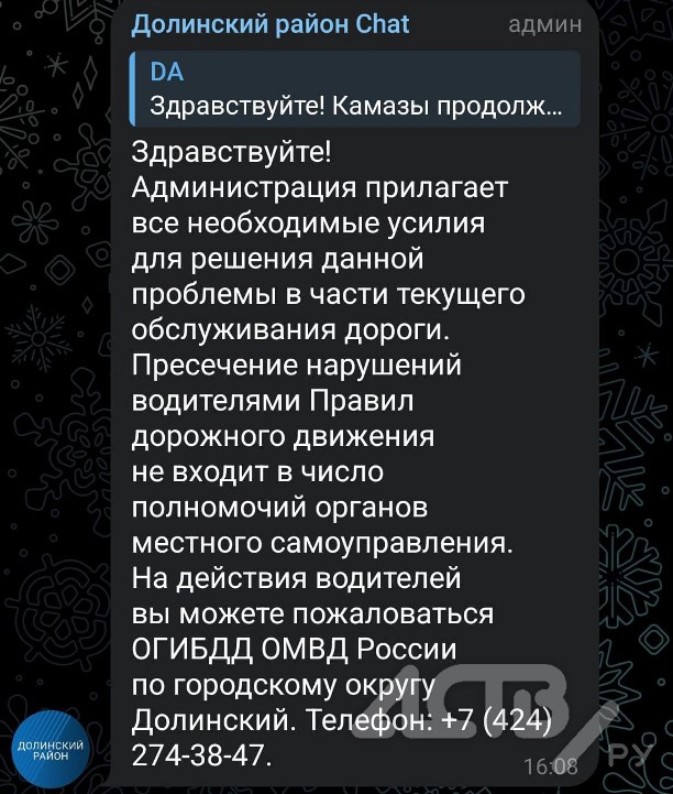 "Администрация Долинского муниципального округа информирует вас о введении временного ограничения движения для грузового транспорта. Причина: критическое состояние автомобильной дороги на участке улицы Вилкова (по направлению к мысу Острый). Период действия: с 14:00 часов 11 ноября 2025 года по 28 ноября 2025 года включительно. Ограничение: