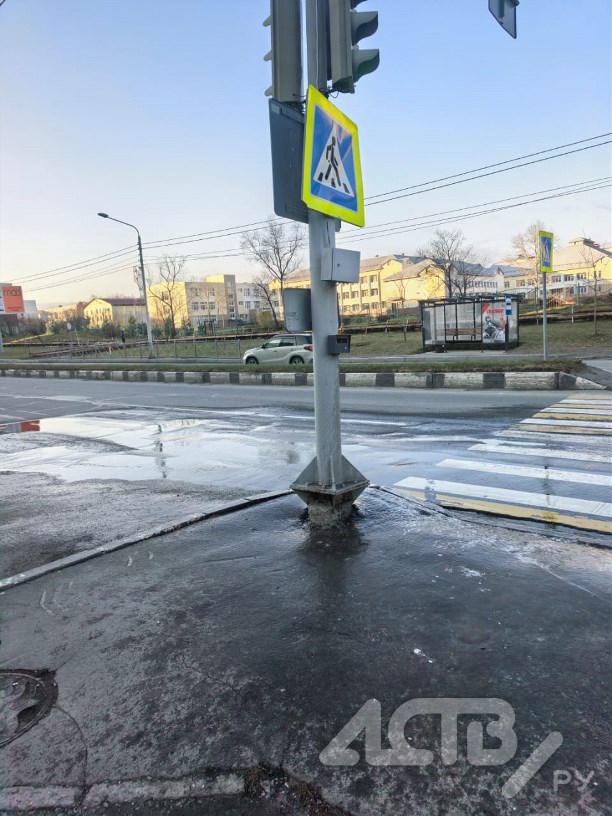 Пешеходный переход подтопило прямо перед школой в Южно-Сахалинске. Утром 14 ноября лужа подмёрзла, и дети, спешащие на уроки, буквально "летели под машины", сообщила astv.ru очевидица.