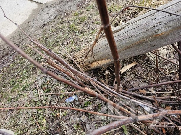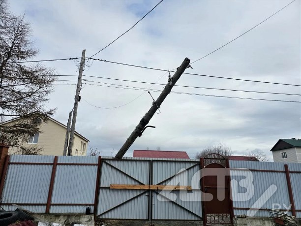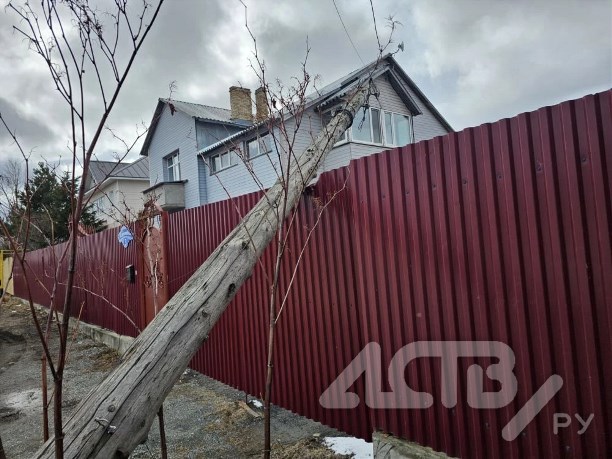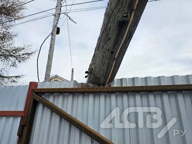 Старый столб упал прямо на ворота жителя села Троицкого. Происшествие случилось днём 12 апреля на улице Сиреневой.