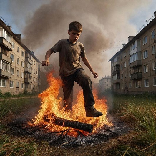 Пока пожарные расчёты были в пути, мимо проходил мальчик. Не раздумывая, он начал затаптывать огонь ногами, стараясь не дать пламени распространиться.