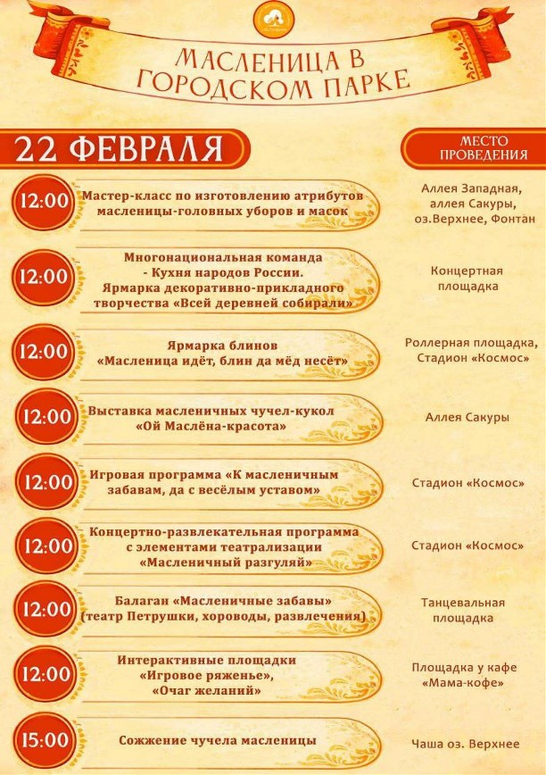 Гостей ждут мастер-классы, различные ярмарки и выставки, интерактивные площадки, балаган "Масленичные забавы" и многое другое. Кульминацией праздника станет сожжение чучела на озере Верхнем. Подробная афиша — в карточке: