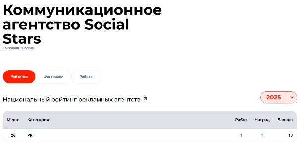 Методология НРРА, разработанная Sostav совместно с АКАР, заслуживает отдельного внимания. В отличие от рейтингов, оценивающих объем медиазакупок, где лидируют гиганты вроде «СберМаркетинга» с биллингом под 64 млрд рублей, Национальный рейтинг рекламных агентств оценивает качество интеллектуального продукта. Баллы начисляются за победы и призовые места на ключевых индустриальных фестивалях: «Большая рыба», Silver Mercury, Red Apple, White Square и других. Вес каждой награды калибруется, а данные берутся исключительно из официальных источников, что делает результаты максимально прозрачными. Абсолютным лидером рейтинга стал Т-Банк, который благодаря 40 наградам за 17 работ набрал 283,2 балла, значительно оторвавшись от ближайших конкурентов. В десятку сильнейших также вошли G Communications, «Брусника», СИБУР, «Полилог», а на восьмом месте расположился «СберМаркетинг» — крупнейший игрок по объему медиазакупок, который в рейтинге интеллектуального продукта набрал 31,2 балла. Высокая конкуренция прослеживается на всех уровнях: так, на 14-й строчке с 21 баллом сошлись сразу семь участников, включая «АГТ», «Аэродинамику» и Школу коммуникаций НИУ ВШЭ. На этом фоне 26-е место, которое Social Stars делит с DPG Russia, «СберСпасибо», PR Consulta и «БУАРОН», выглядит особенно показательно. Всех их объединяет одна подтвержденная работа, получившая признание профессионального сообщества, которая принесла им по 10 баллов. Для большинства компаний из этого списка попадание в рейтинг стало результатом многолетней работы, но для Social Stars этот результат стал подтверждением правильности выбранной стратегии: вместо гонки за количеством проектов — концентрация на качестве и глубине проработки каждого отдельного кейса.