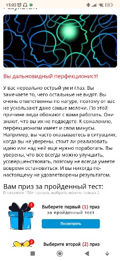 У вас нереально острый ум и глаз. Вы замечаете то, чего остальные не видят. Вы очень ответственны по натуре, поэтому от вас не ускользают даже самые мелочи. По этой причине люди обожают с вами работать. Они знают, что вы их не подведете. К сожалению, перфекционизм имеет и свои минусы. Например, вы часто оказываетесь в ситуациях, когда вы не уверены, стоит ли реализовать идею или над ней еще нужно поработать. Вы уверены, что все всегда можно улучшить, усовершенствовать, поэтому не всегда умеете вовремя остановиться. И вы никогда по-настоящему не удовлетворены результатом.