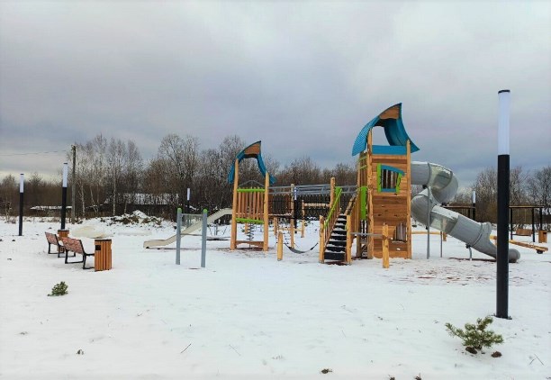 На игровой площадке уложили резиновое покрытие, тротуарную плитку, террасную доску, установили освещение, малые архитектурные формы.