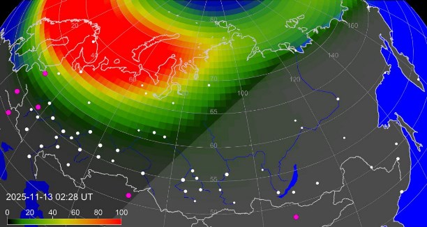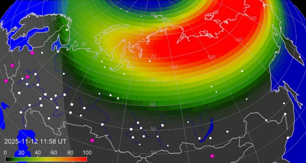 Накануне Лаборатория солнечной астрономии (XRAS) предупреждала, что наблюдается формирование зоны полярных сияний высокой интенсивности на территории РФ, связанное как с приближением ночного времени суток, так и с очередным ростом параметров солнечного ветра и геомагнитной активности. Astv.ru сообщал, что также фиксировали очень сильную магнитную бурю планетарного масштаба.