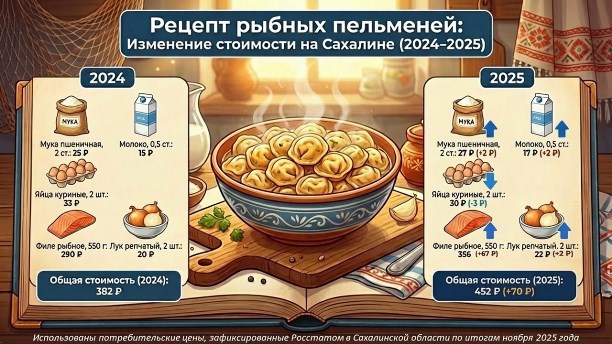 По данным экономистов, стоимость набора продуктов для приготовления сахалинских пельменей составила 452 рубля. Годом ранее, в 2024 году, этот же набор обходился в 382 рубля. Основной причиной подорожания стало увеличение цены на рыбное филе, ключевой ингредиент для начинки.