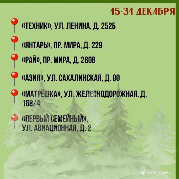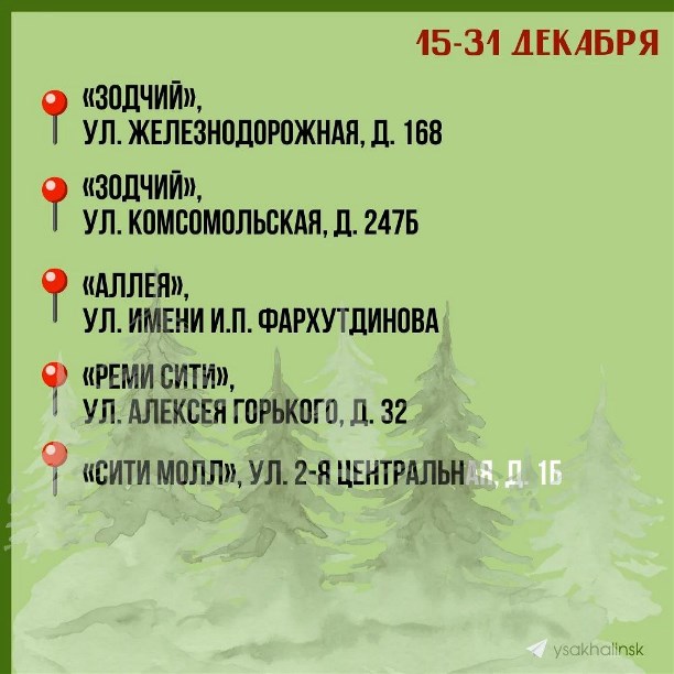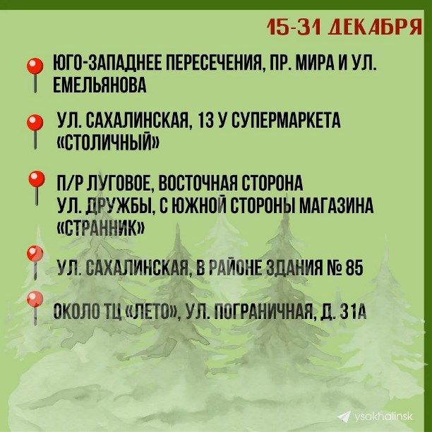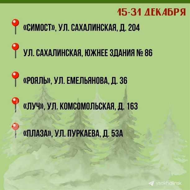 Чтобы вы легко нашли свою "зелёную красавицу", в администрации Южно-Сахалинска подготовили список с адресами ёлочных базаров.