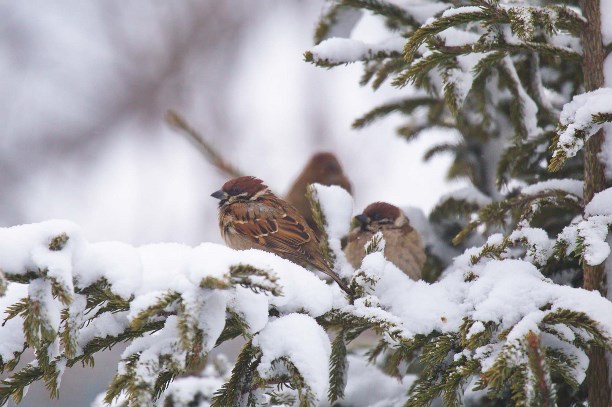 Полевые воробьи у кормушки заповедника "Курильский" в пгт Южно-Курильск. Автор фото: Сергей Стефанов.