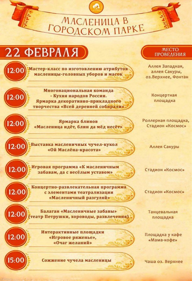 Жителей областного центра и гостей приглашают отметить вкусный праздник 2026 года — Масленицу — на народных гуляниях. Вас ждут мастер-классы, ярмарка, игровая и концертная программа, а в конце — сожжение чучела. Подробнее — на карте мероприятий и афише от городского парка им. Гагарина.