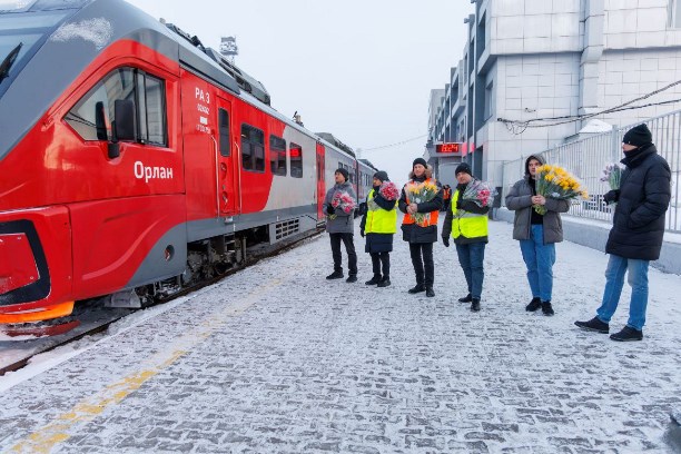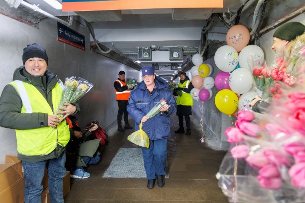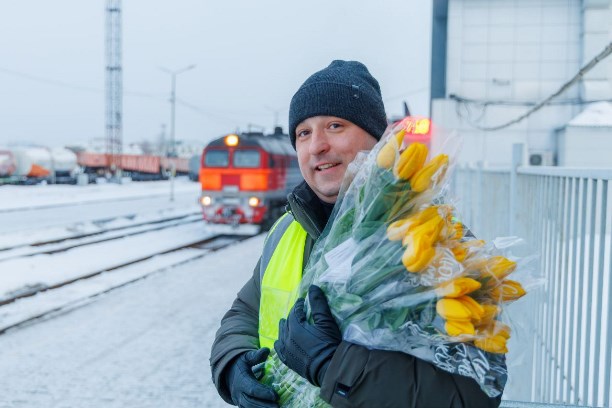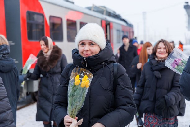 Первый утренний поезд 6 марта прибыл на станцию в 07:27. Сотрудники компании подготовили для пассажирок весенний сюрприз — каждому выходящему из вагонов вручали цветы и поздравляли с праздником.