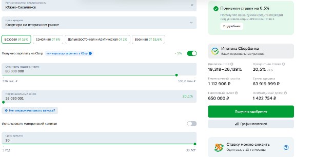 Самая дорогая квартира за 80 млн рублей доступна в ипотеку. Теоретически. Однако по "льготным" программам нужен первоначальный взнос 74 млн. рублей. Остаётся базовая ипотека, которая предлагает:
