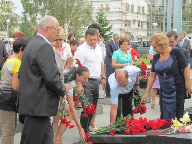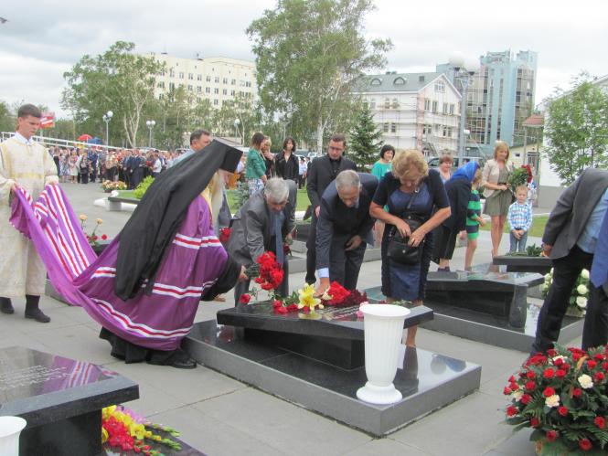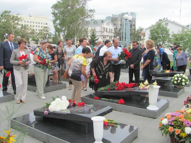 Представители церкви, правительства Сахалинской области и жители города почтили память погибших минутой молчания и возложили цветы к их могилам.