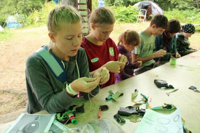 На других лесных уроках ребята получали азы туризма по укладке рюкзака, вязке узлов, топознакам и прохождению переправы; овладевали прикладными техниками на «Истоке творчества» – рисовали углем, создавали амулеты из кожи, плели фенечки, оформляли экосумки в рамках проекта «100% НеПакет». На тропе «Лесные очумельцы» мастерили полезные предметы и сувениры из неживого природного материала, а в качестве подарка на юбилей «Родника» создали совместный макет будущего лагеря. В течение смены было реализовано 5 экологических проектов: об экотехнологиях настоящего и будущего, о растениях и природных достопримечательностях на экотропе в районе лагеря, о причинах и следствиях лесных пожаров, о дикоросах Сахалина и правилах поведения туристов в природе.