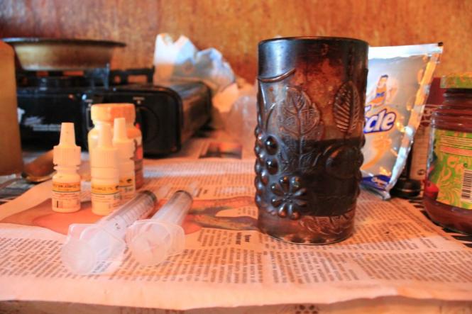 На место происшествия выехали сотрудники спецгруппы сахалинского Наркоконтроля, которые обнаружили следующее: в помещении, где совсем недавно располагалась парикмахерская, проживает женщина 1974 года рождения вместе со своей несовершеннолетней дочерью. Не стесняясь присутствия своей дочери, 40-летняя женщина готовила наркотический дурман, который она и ее друзья употребляли внутривенно.