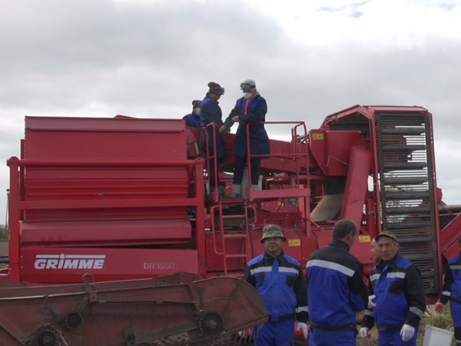 \tОт ручной уборки к автоматической. Вот эта внушительного размера техника немецкого производства называется картофелеуборочным комбайном. На борту машины - три человека.
