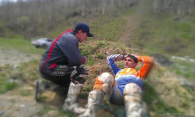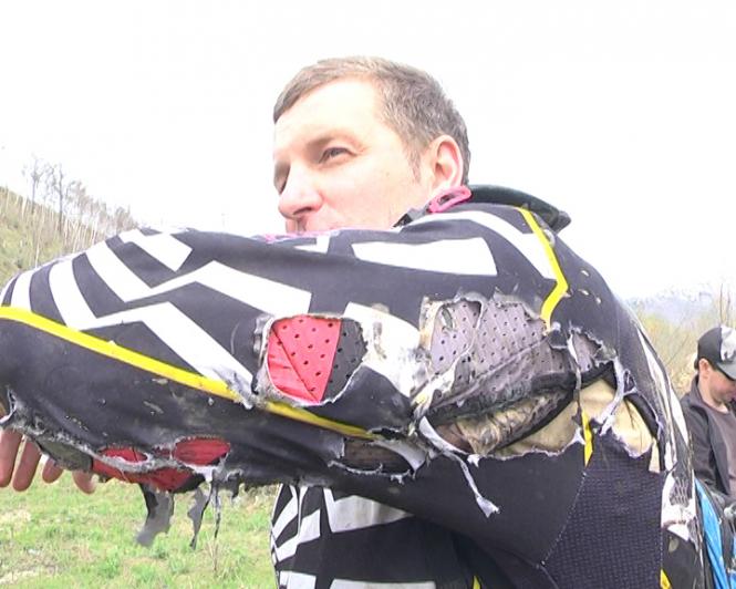 На снимке внизу — один из участников чемпионата Евгений Латышев, во время гонки упавший на горячий глушитель своего мотоцикла. Итог — сожженная экипировка.